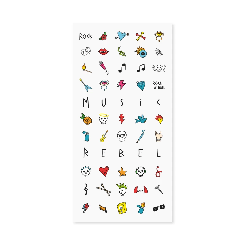 Avec un total de 55 stickers, vous retrouverez des motifs symbolisant l’univers rock et punk, incluant :