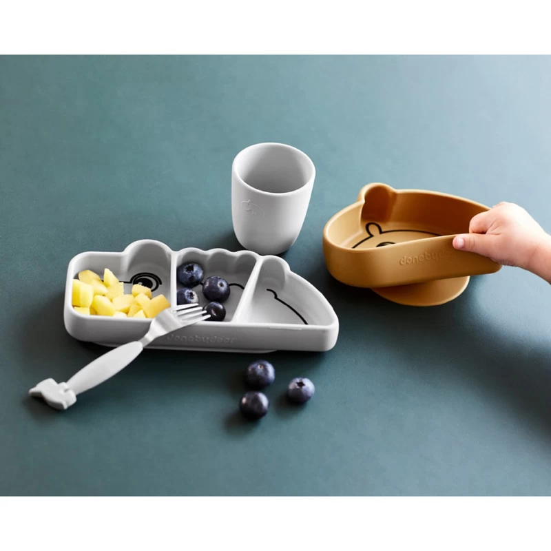 L’assiette à goûter antidérapante avec trois compartiments séparés restera en place et encourage les petits mangeurs à manger de manière autonome.