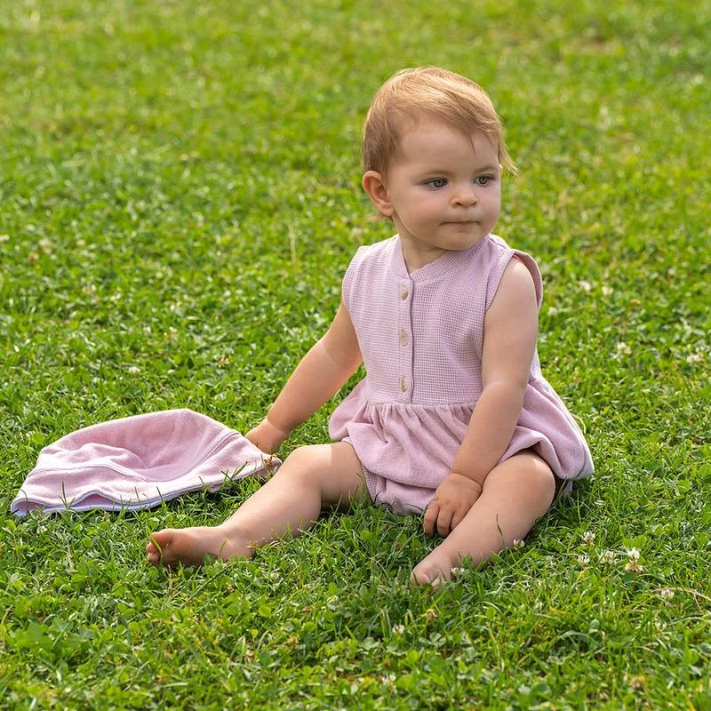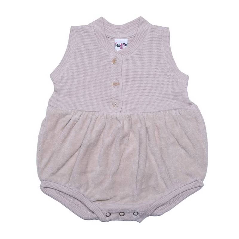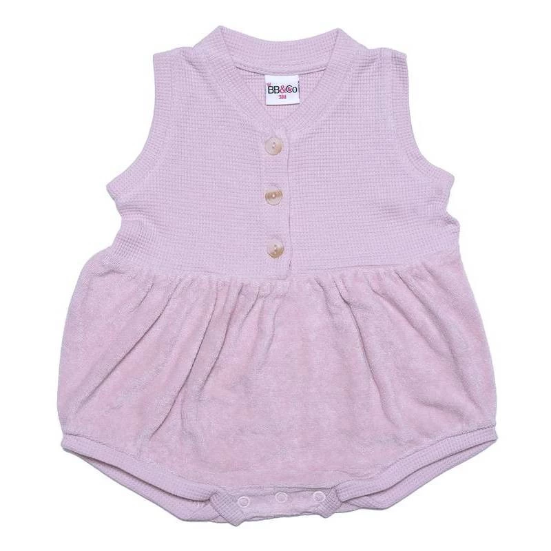 Barboteuse aussi jolie que pratique, 100% coton, éponge sur le bas et coton intissé sur le haut, pour un maximum de confort.