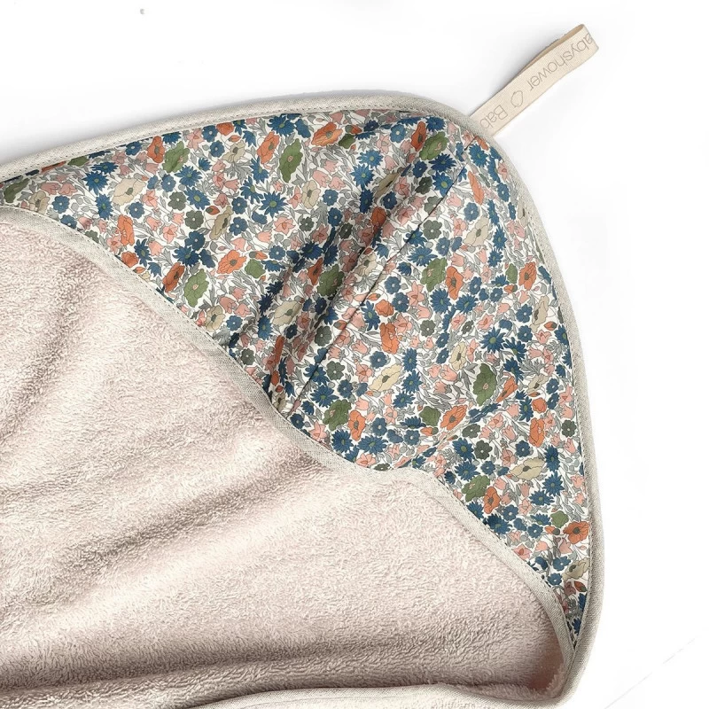 Serviette large en tissu beige moelleux, 100% coton. Capuche doublée en tissu imprimé liberty