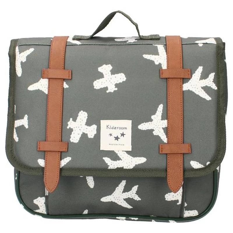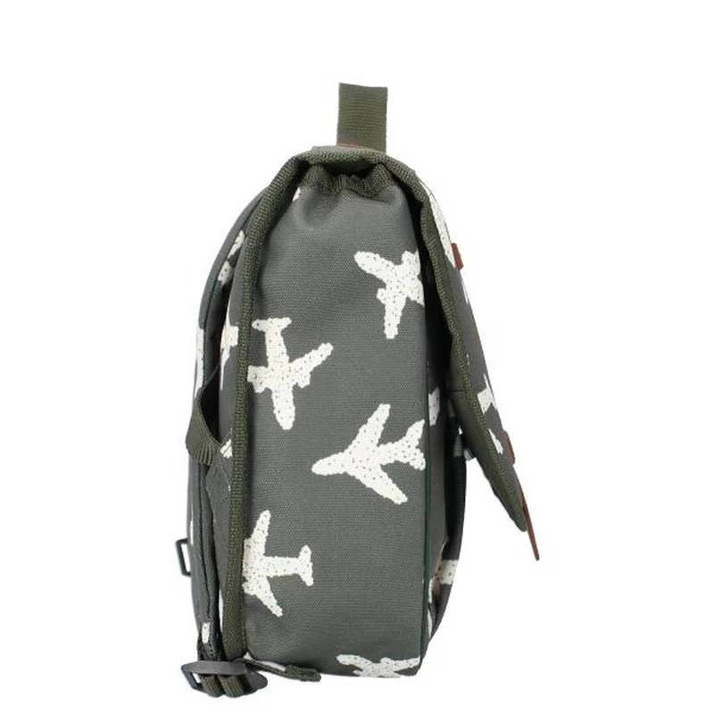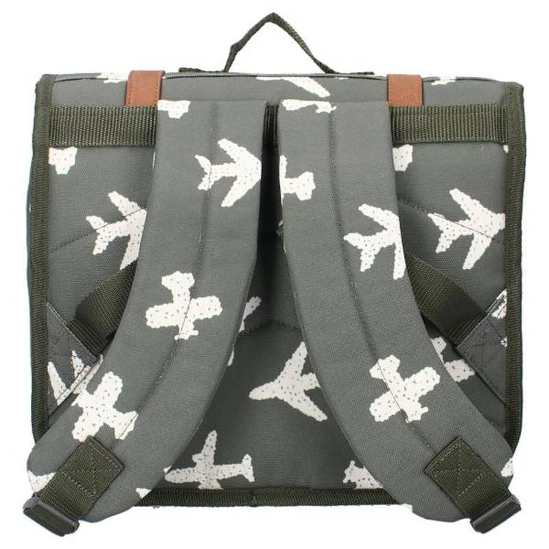 Le sac est de couleur vert armée et comporte un imprimé d’aéroplanes blancs sur toute sa surface.