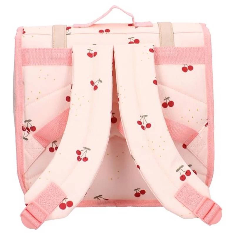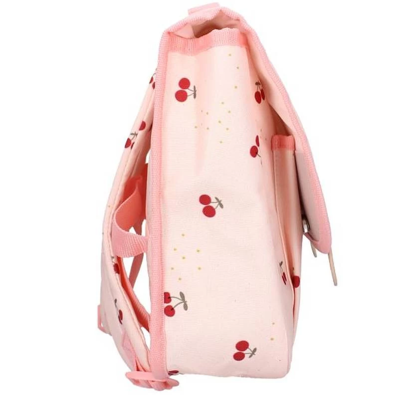 Le sac est de couleur rose et comporte un imprimé de cerises rouges.