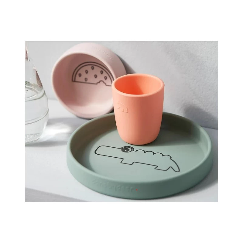 Une assiette verte Croco, un bol rose avec une pastèque et un mini gobelet rouge corail font de ce joli coffret une adorable idée cadeau pour les tout-petits.