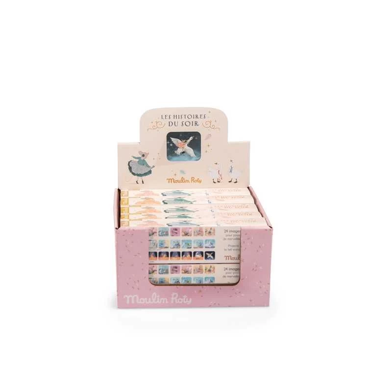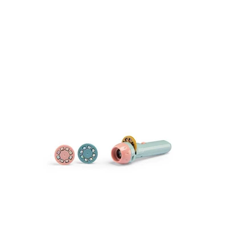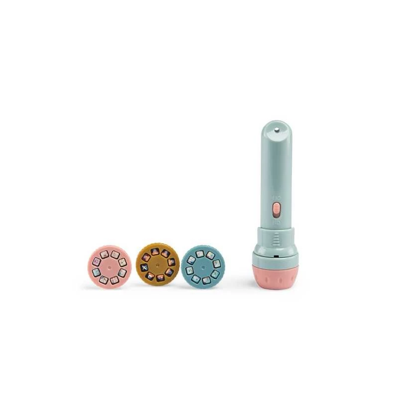 Facile d’utilisation, cette lampe fonctionne avec trois piles bouton incluses. Il suffit d’insérer un des disques dans la fente, d’allumer la lampe et de faire la mise au point pour projeter des images claires et colorées sur les murs ou le plafond. Les images peuvent atteindre jusqu’à 90 cm de largeur, offrant une immersion totale dans l’histoire. Pour avancer dans le récit, il suffit de tourner manuellement le disque.