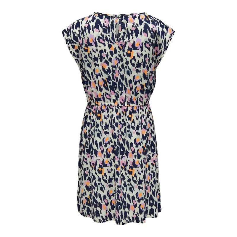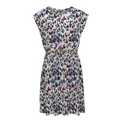 Robe à motif léopard violet, sans manche et col rond. Ajustable à la taille grâce à un cordon en tissus.