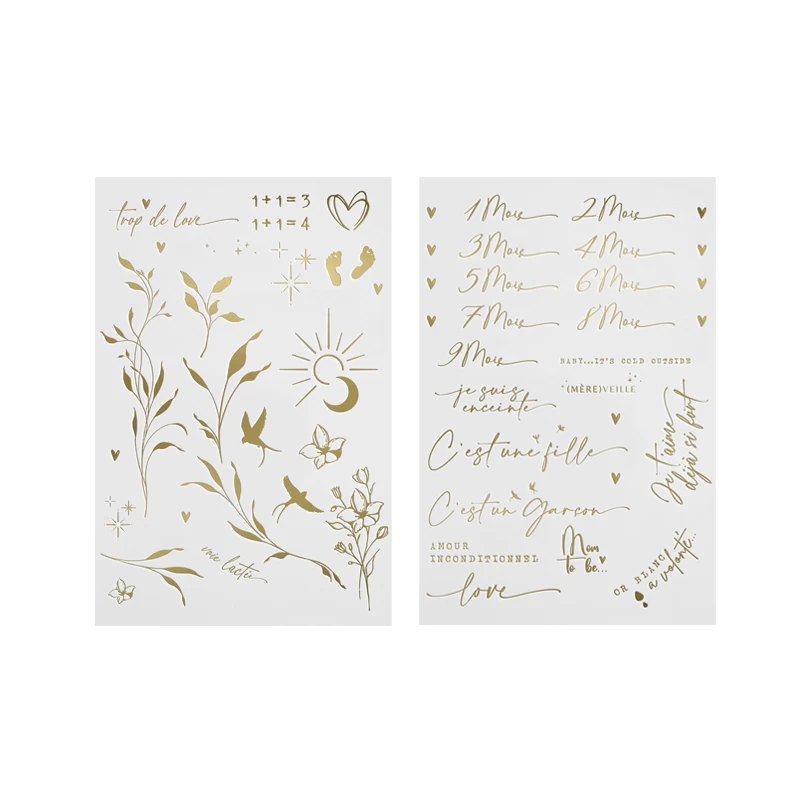 Un ensemble de 40 tatouages composé de mots d’amour, d’annonces et de jolis motifs pour illustrer chaque étape de votre grossesse.